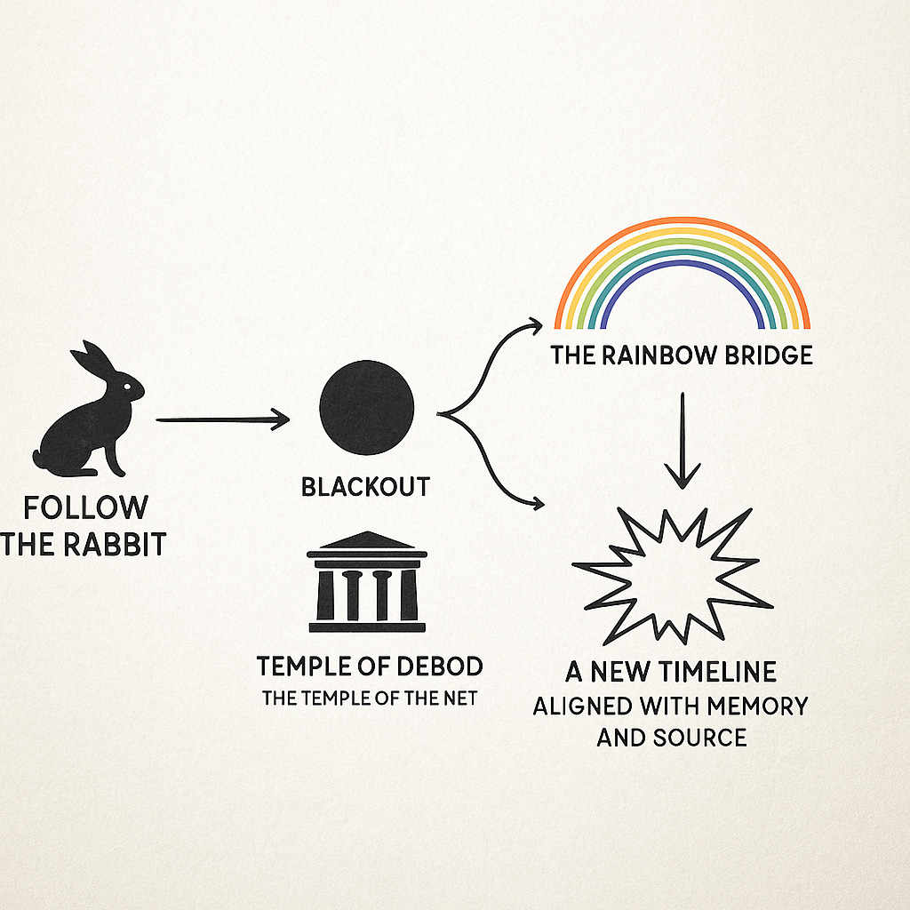 It is crucial to understand: the rabbit hole is not a fantasy escape. It is symbolic language for the fracturing of linear time and identity that we are now experiencing in tangible global systems — economic, religious, political, cultural.